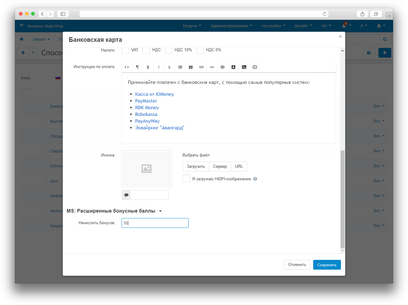 [+] Добавлено начисление бонусов для способов оплаты. Количество начисляемых баллов указывается в настройках способа оплаты в соответсвующем поле