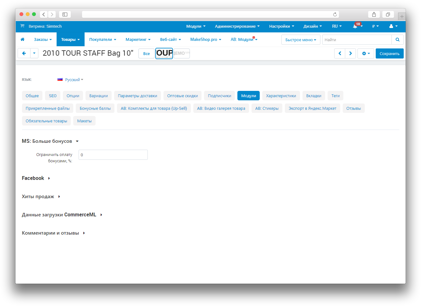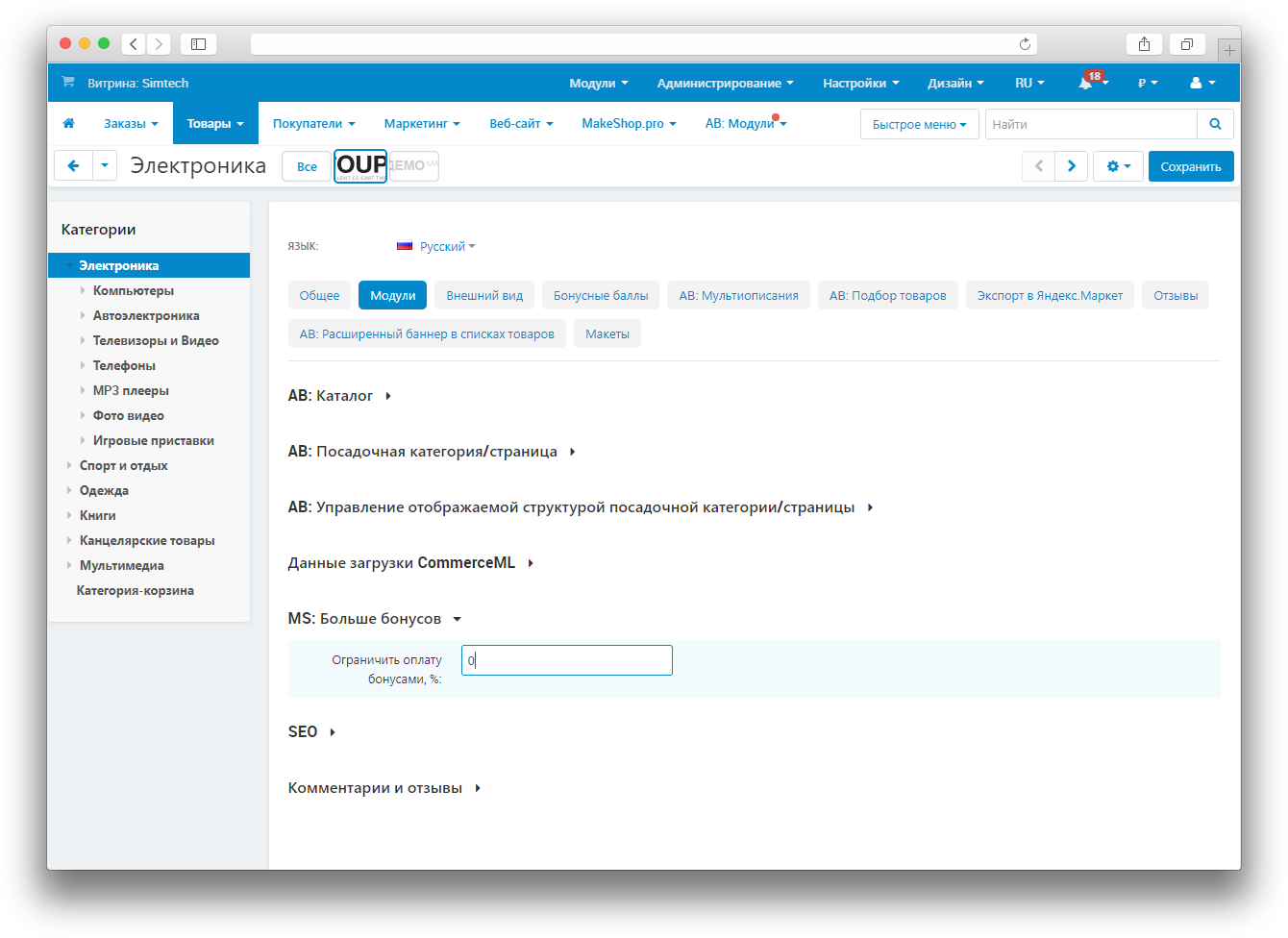 - Настройка процента от цены товара, который можно оплатить бонусами (с возможностью указать свои проценты для отдельных категорий и/или товаров).