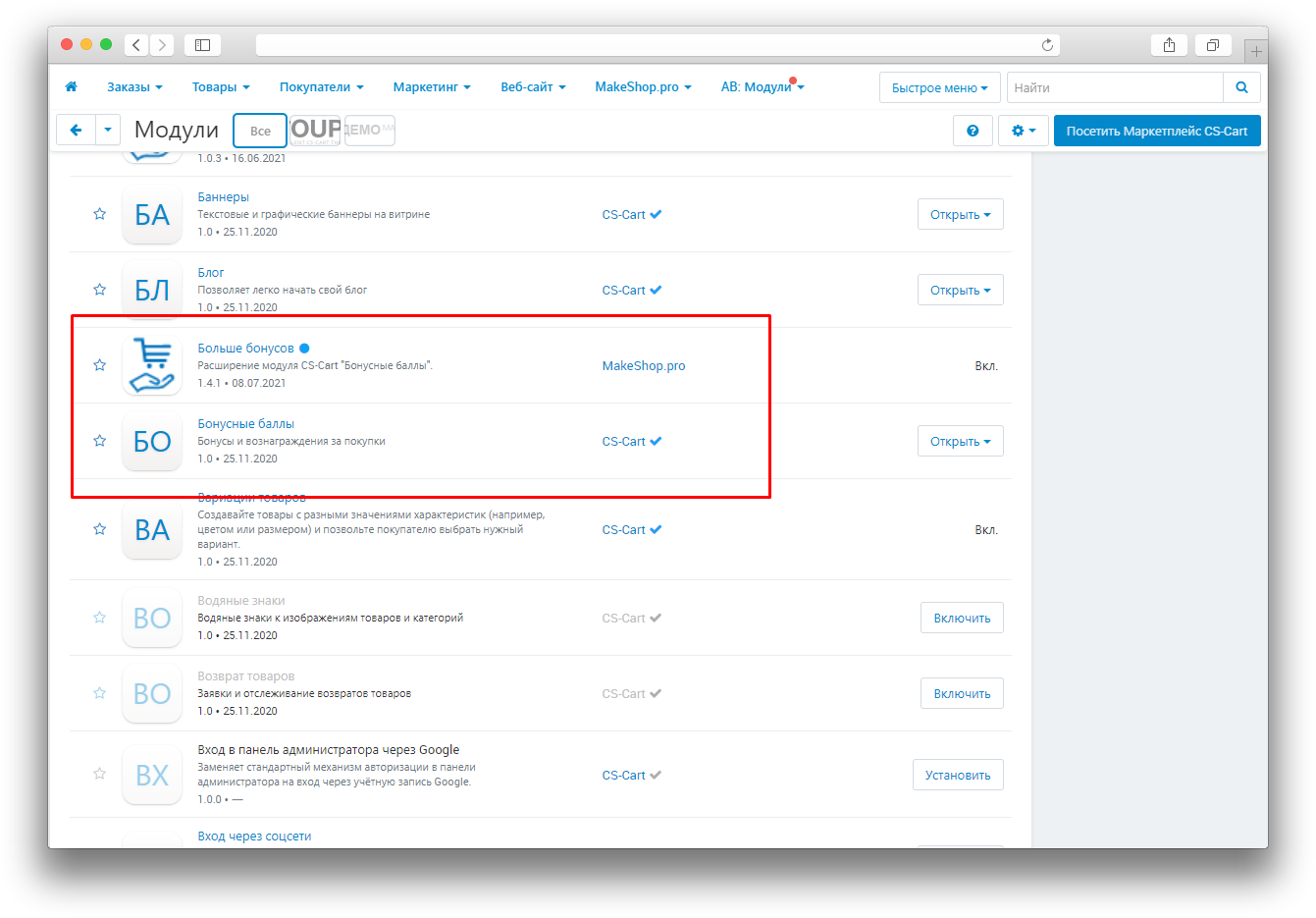 Для корректной работы требуется настройка двух модулей: модуля CS-Cart "Бонусные баллы" и модуля "Больше бонусов".