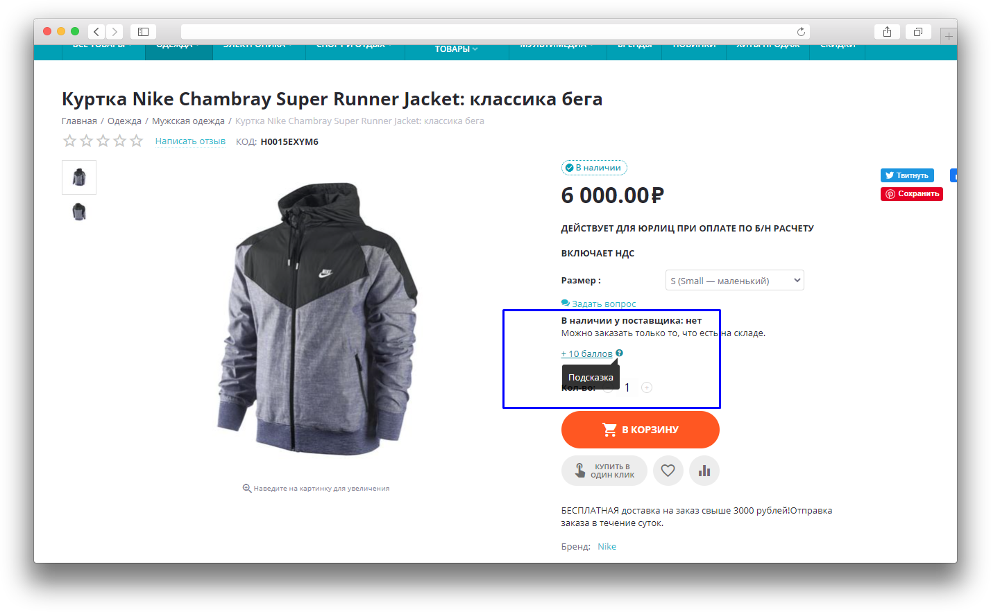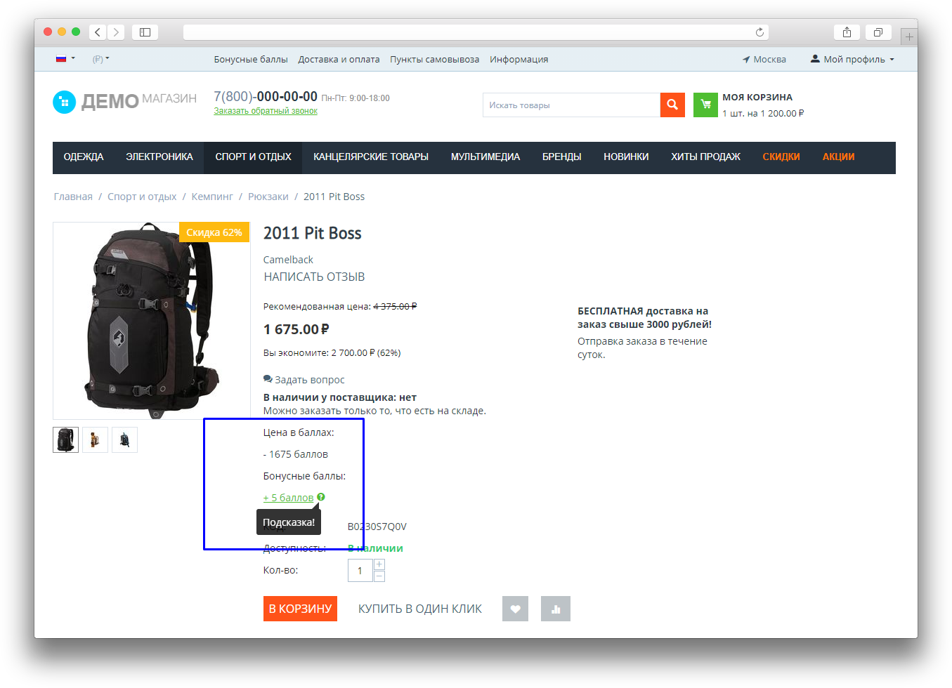- Настраиваемый вывод информации (количество бонусов, ссылка на программу лояльности, всплывающая подсказка) в карточке товара.