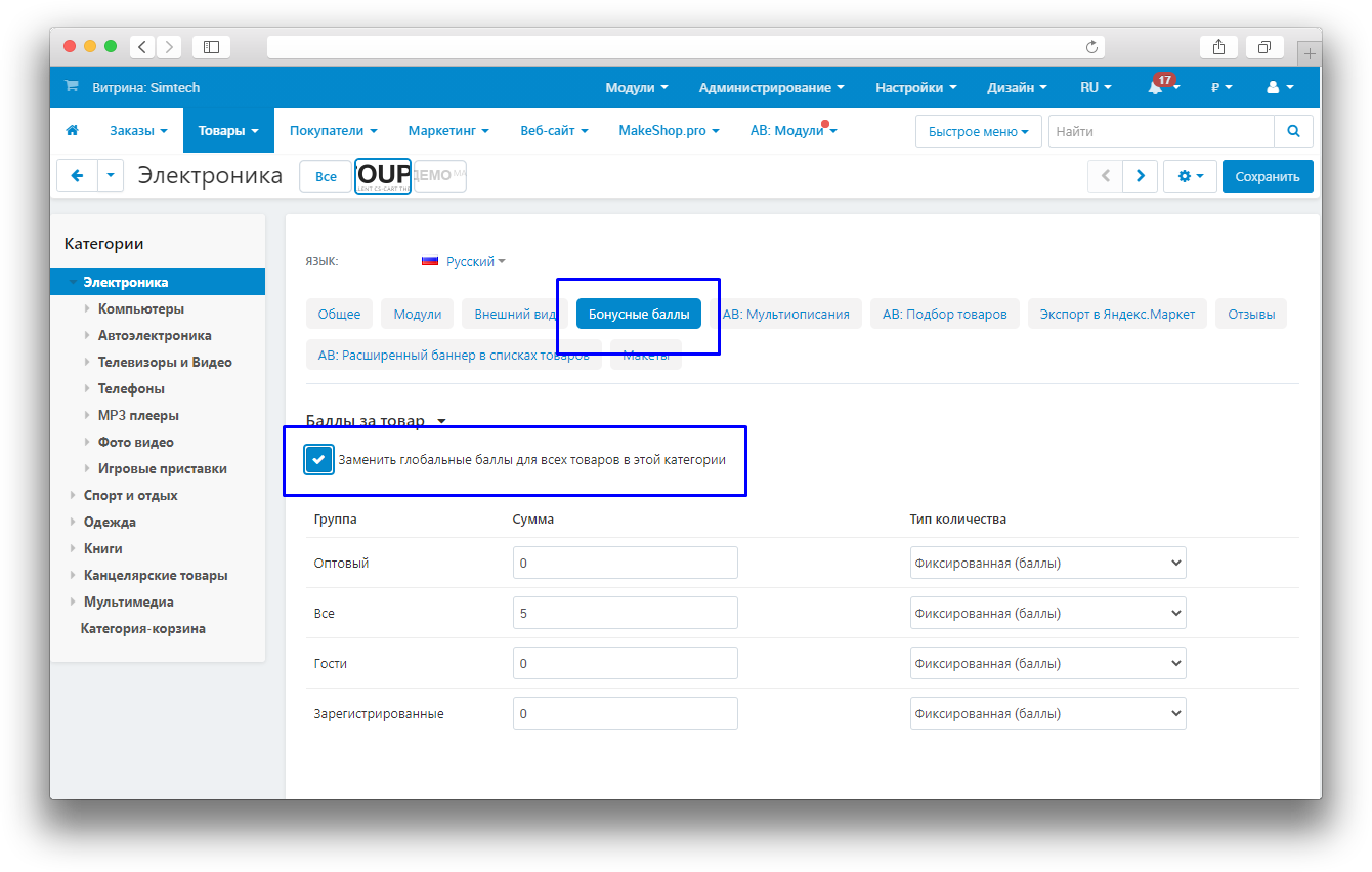 Так же можно задать эти значения отдельно для категории (применяется только если поставить галочку Заменить глобальные баллы для всех товаров в этой категории).