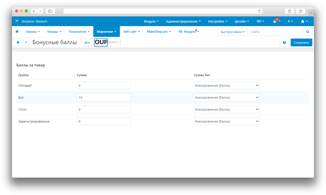 Здесь выставляется глобальное значение количества бонусных баллов, начисляемых за покупку товара различным группам пользователей.