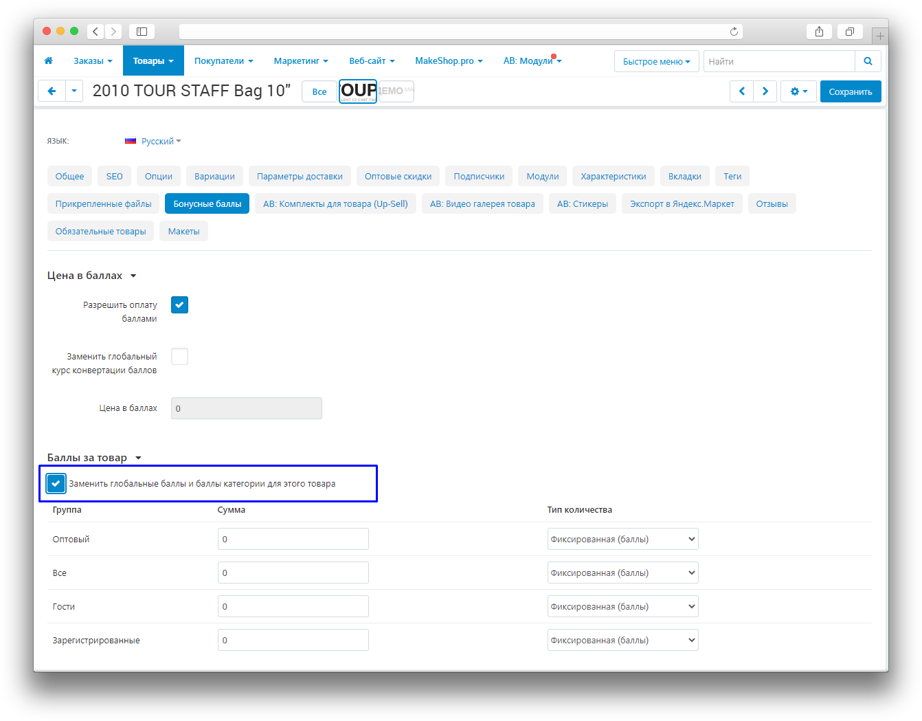 И для конкретного товара (применяется только если поставить галочку Заменить глобальные баллы и баллы категории для этого товара).