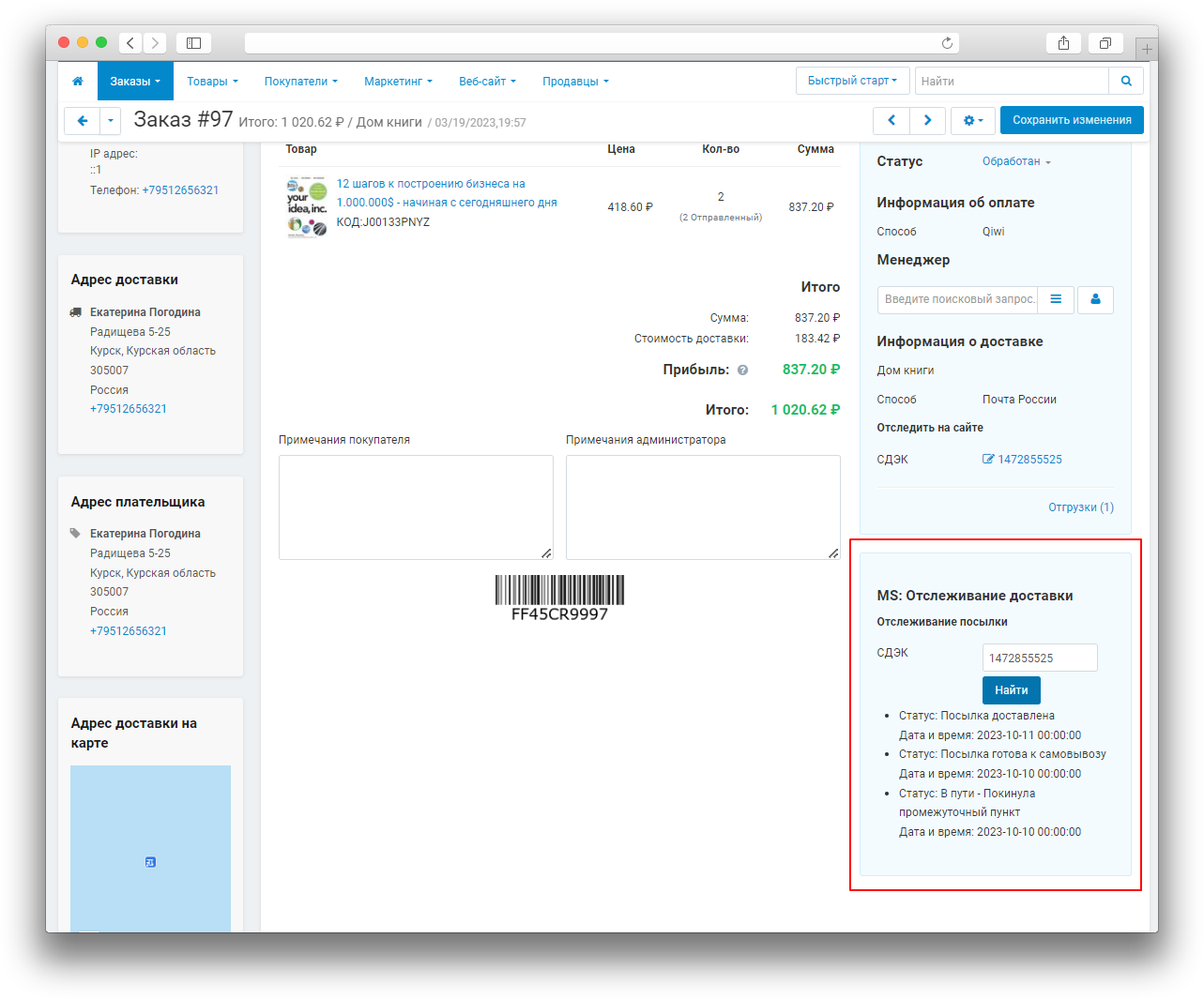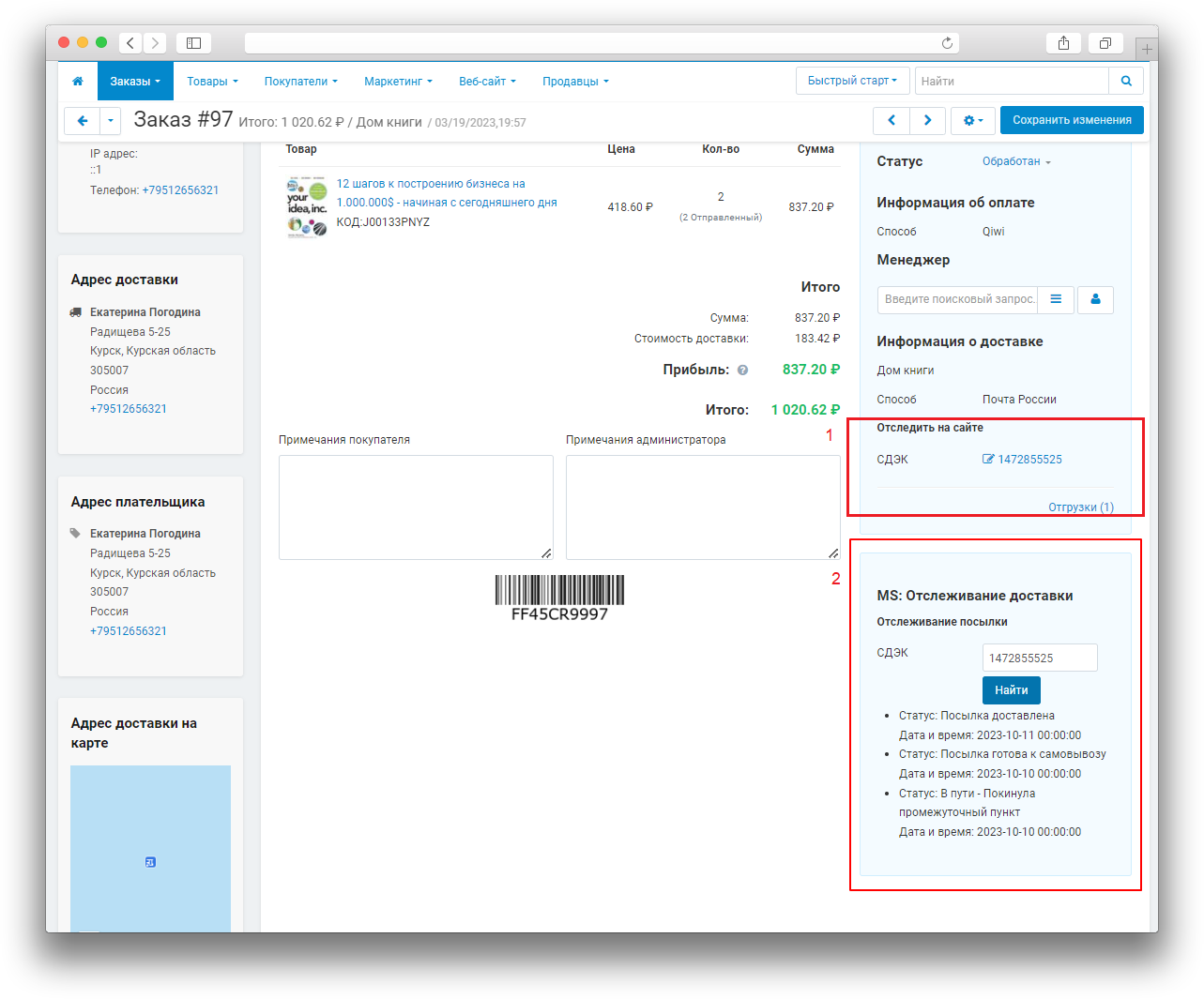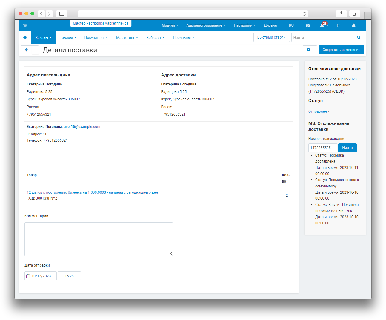 Через Панель администратора → Заказы → Все заказы открыть страницу деталей нужного заказа, где в блоке Информация о доставке (1) ввести трек номер, выбрать службу доставки и сохранить заказ. После сохранения, ниже в блоке MS: Отслеживание доставки отобразится поле с трек номером и информацией по отслеживанию посылки.