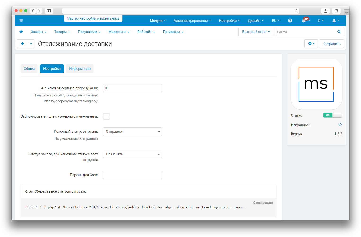 - Поле для ввода API ключа от сервиса https://gdeposylka.ru/;