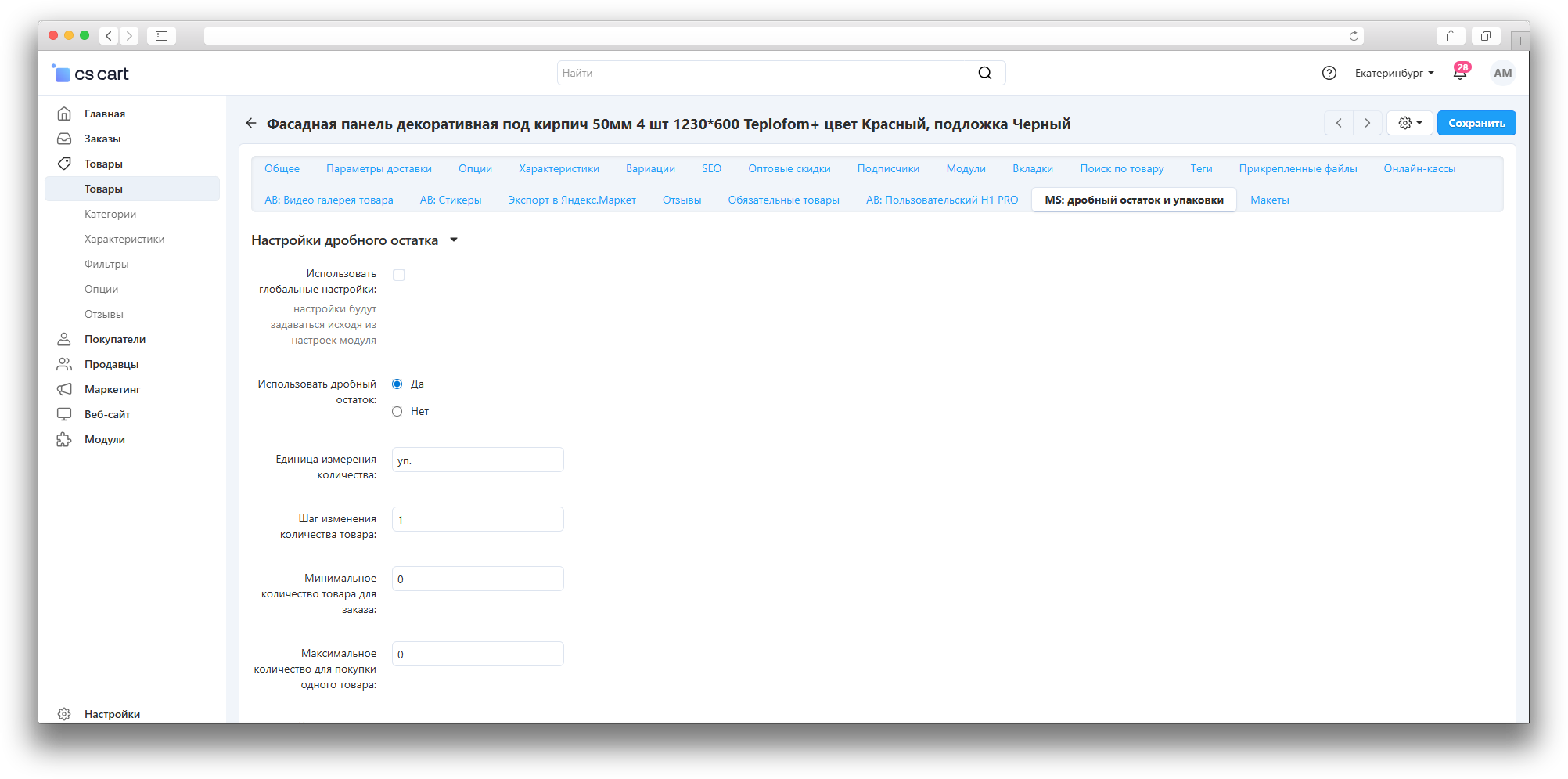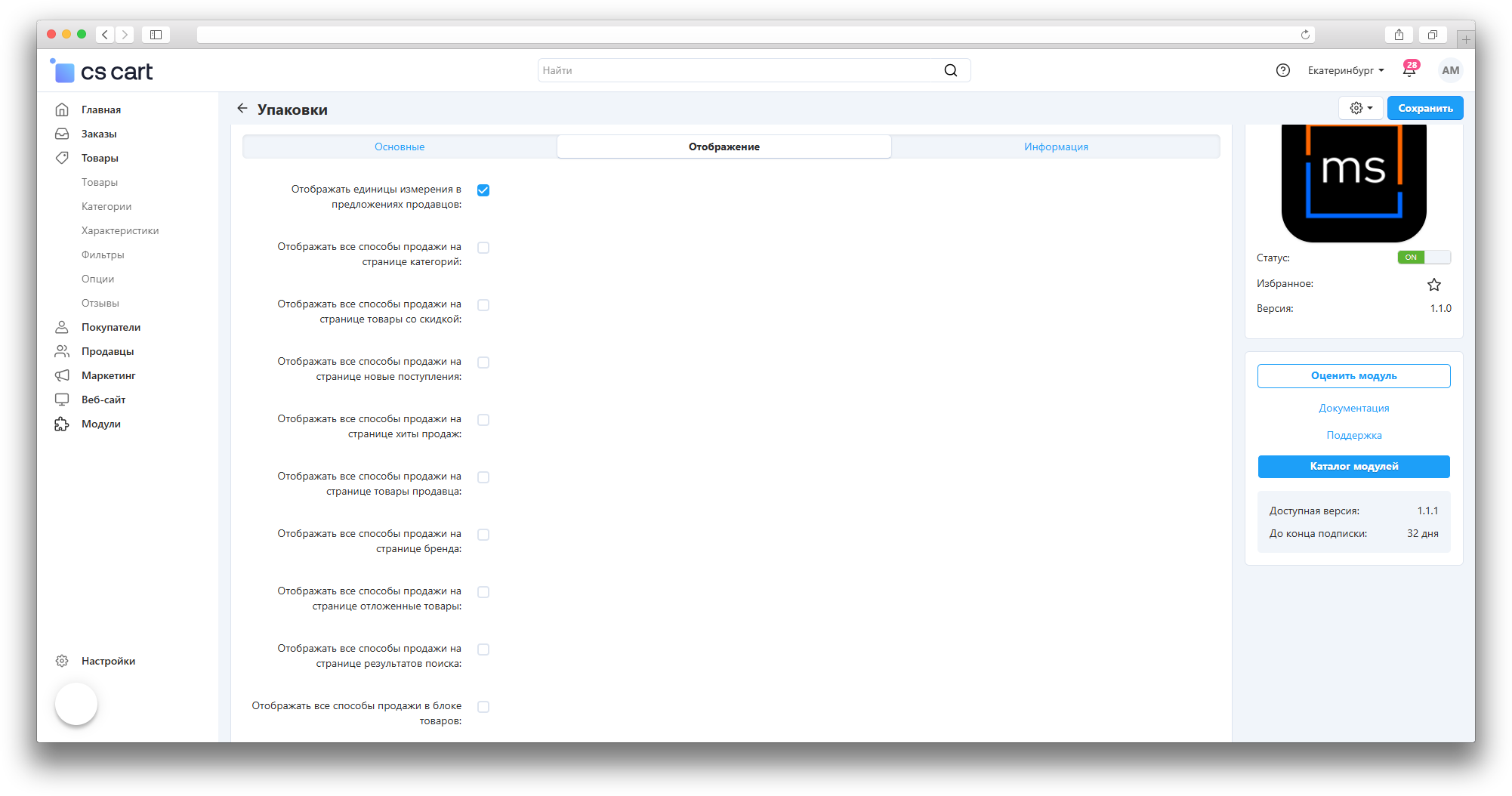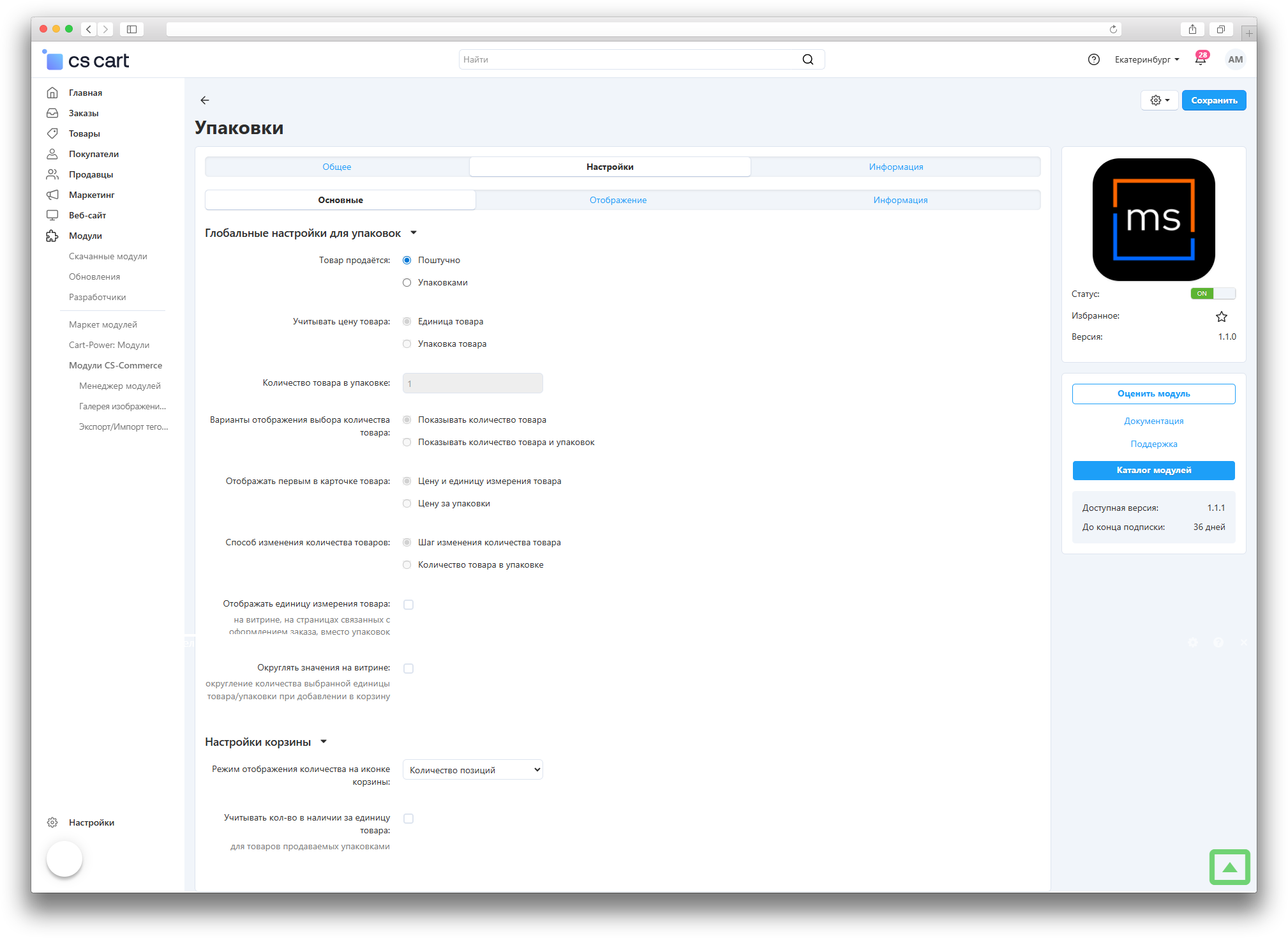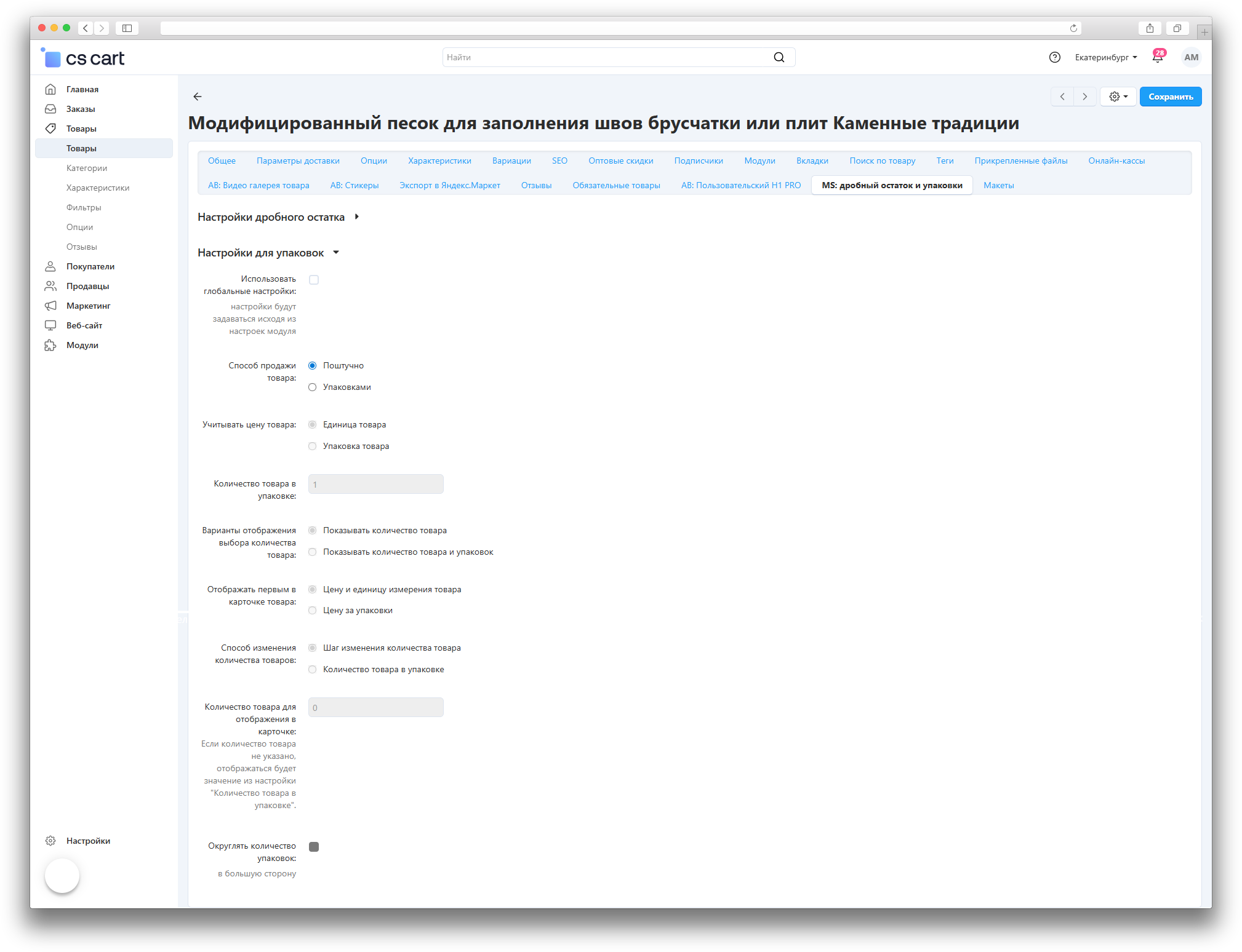 - Упаковками - активирует глобальные настройки для продажи товара упаковками.