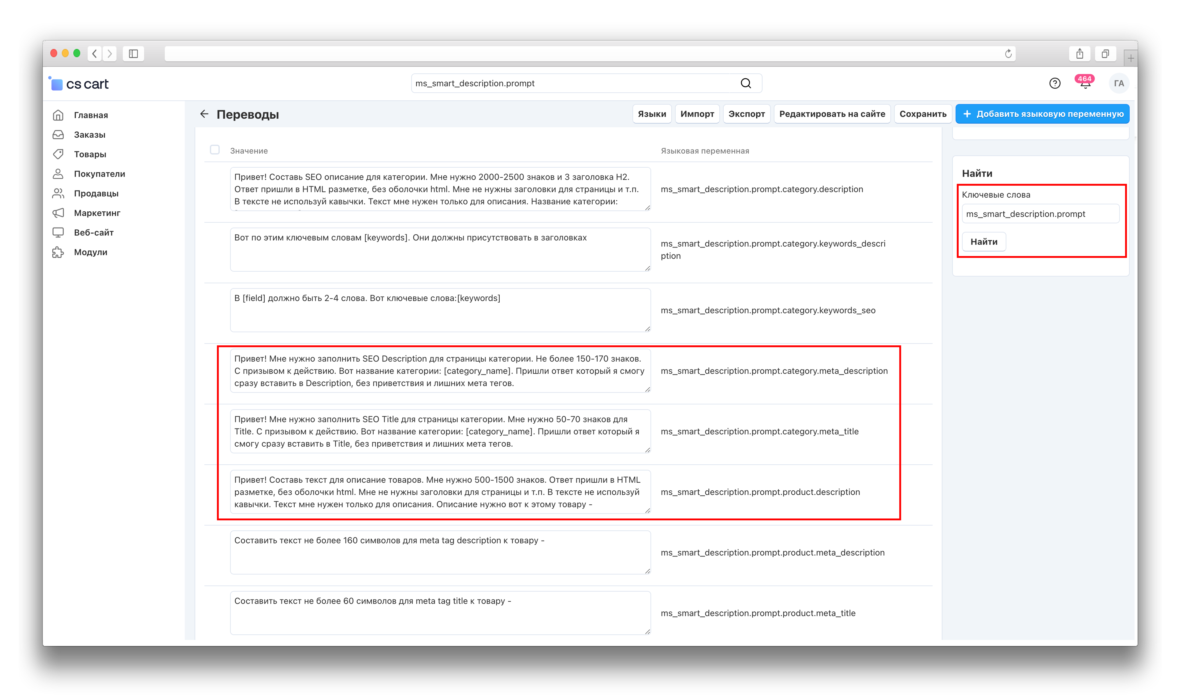 Одной из уникальных возможностей модуля является функция редактирования промтов, которая позволяет вам персонализировать запросы для генерации контента в соответствии с вашими потребностями. Это дает вам полную гибкость в настройке текста, который будет генерироваться для товаров, категорий и SEO-описаний.