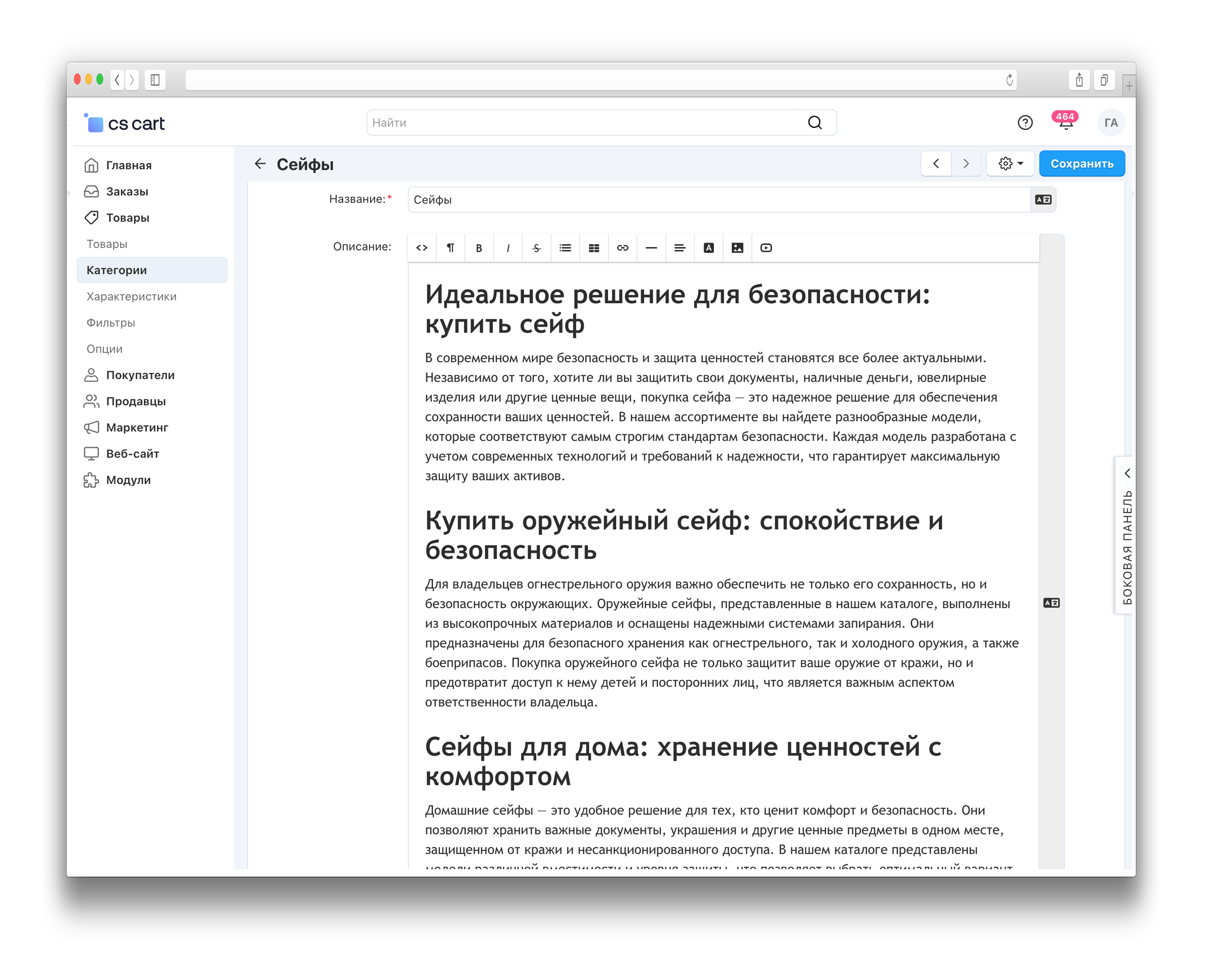 - Генерация SEO описания категорий с заголовками с использованием ключевых слов (ключевые слова указываются в keywords).