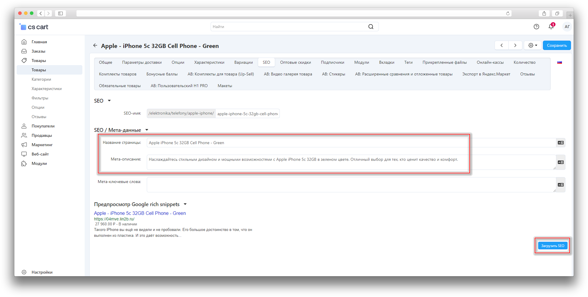 С функцией "Загрузить SEO", модуль мгновенно создает ключевые SEO-данные, включая Название страницы и Мета-описание, повышая тем самым ранжирование ваших товаров в поисковой выдаче и улучшая их органическую видимость.