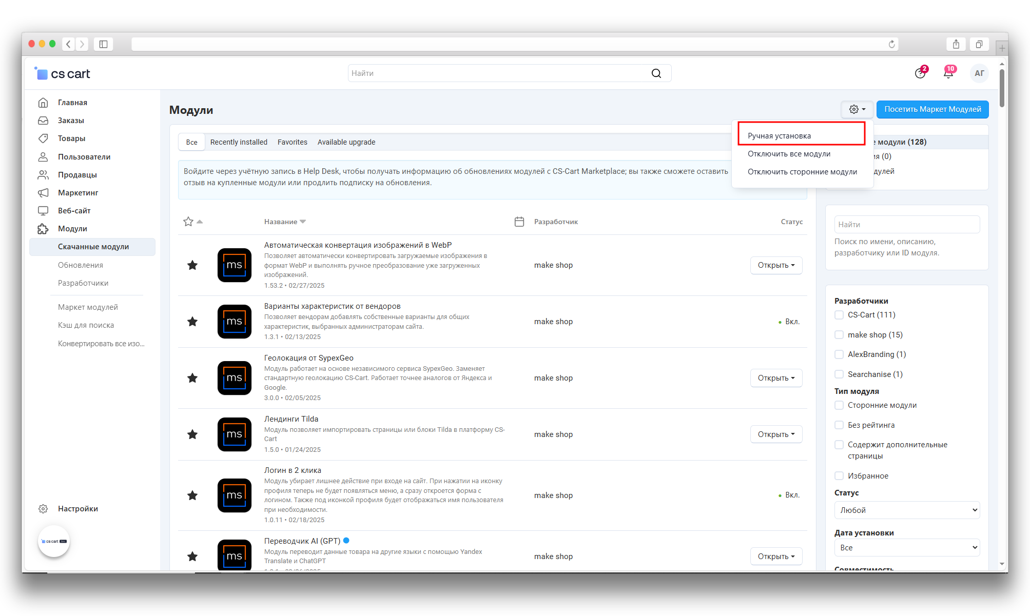 Для версии CS-Cart 4.13.1 и выше Панель администратора → Модули → Управление модулями → Кнопка Шестеренка → Ручная установка.
