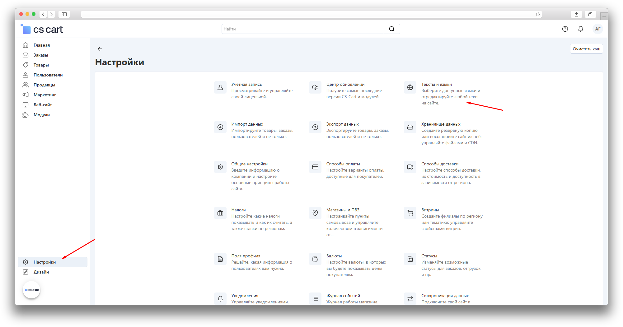 После скачивания модуля, его установка производится штатными средствами CS-Cart на странице Панель администратора → Модули → Управление модулями → Загрузить и установить модуль (+).