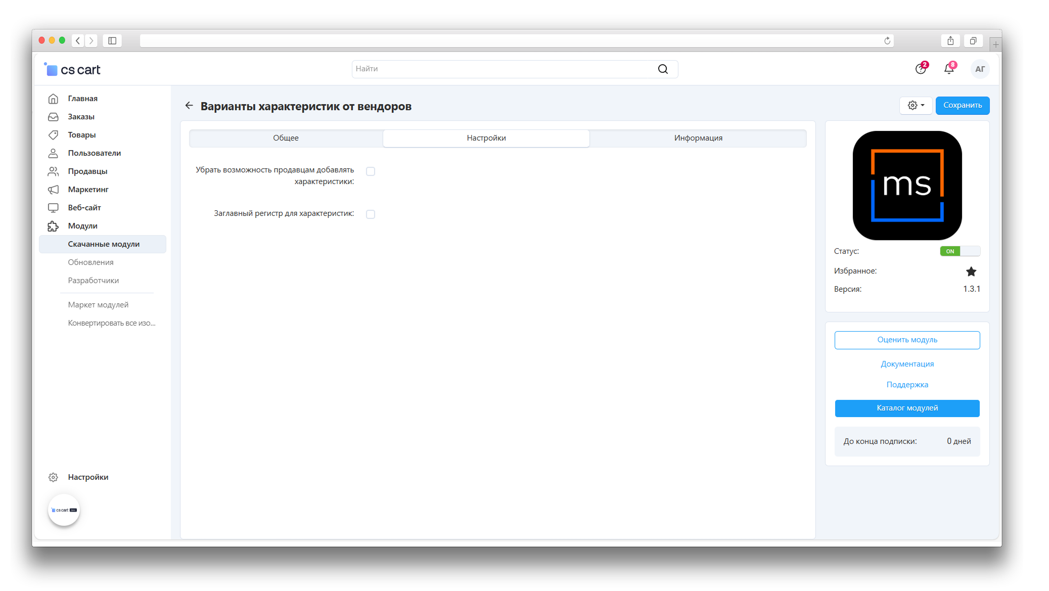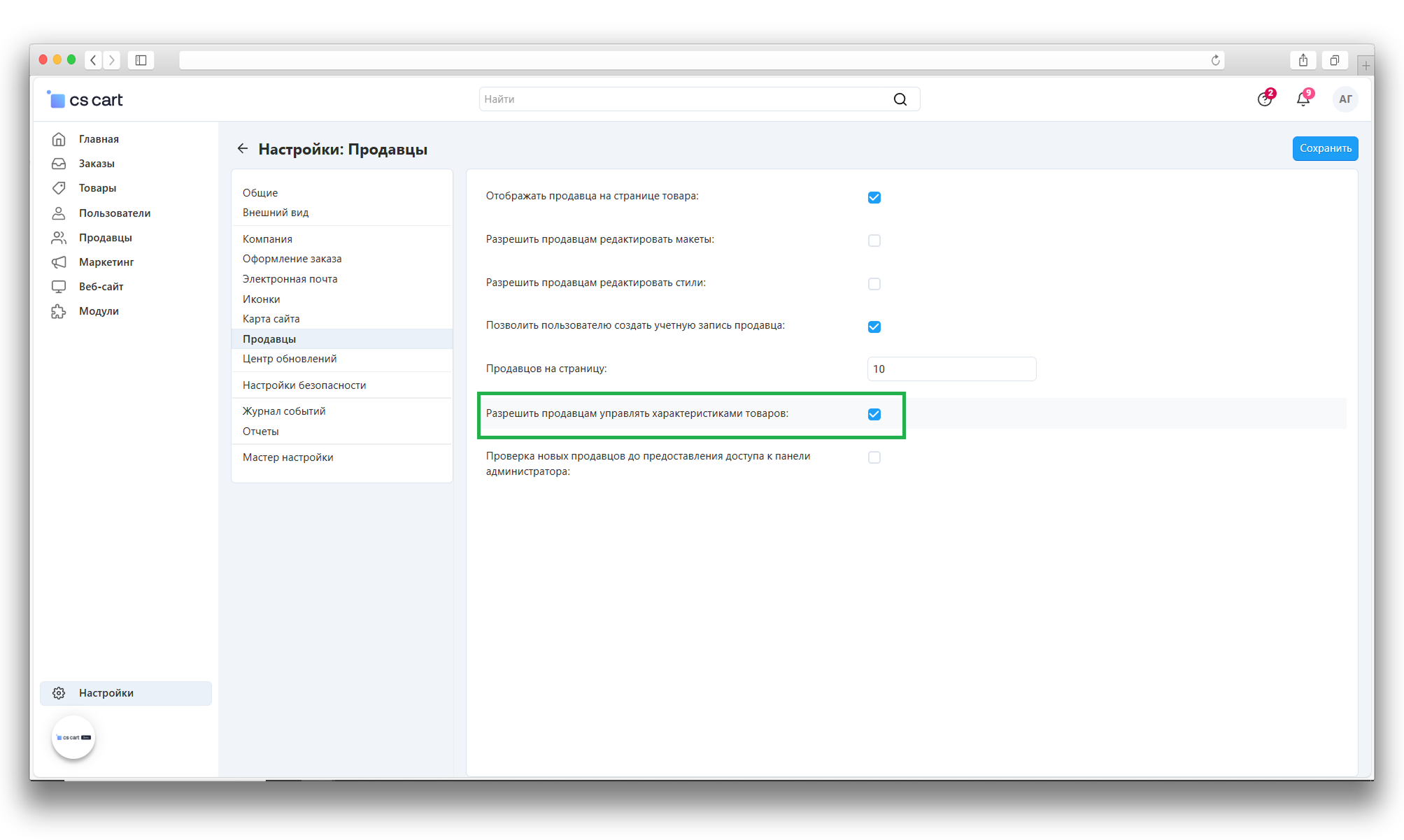 После установки необходимо активировать параметр “Разрешить продавцам управлять характеристиками товаров”. Для этого переходим в Панель администратора → Настройки → Общие настройки → Продавцы и устанавливаем соответствующий чекбокс: