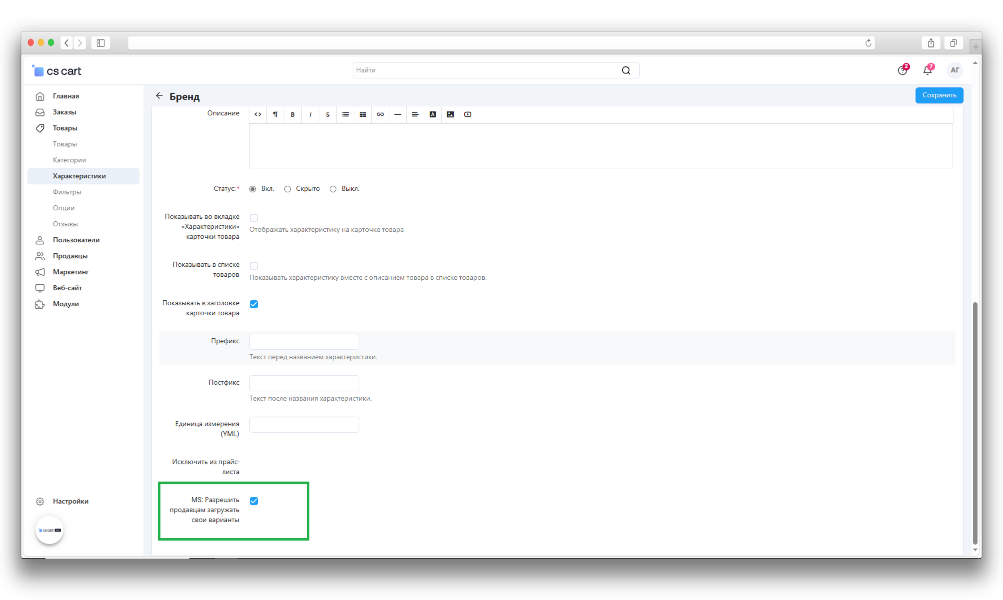Далее нужно разрешить для каких характеристик продавцы смогут добавлять новые значения. Для этого выполняем следующие действия: Панель администратора → Товары → Характеристики, переходим в необходимую характеристику и активируем данный параметр: