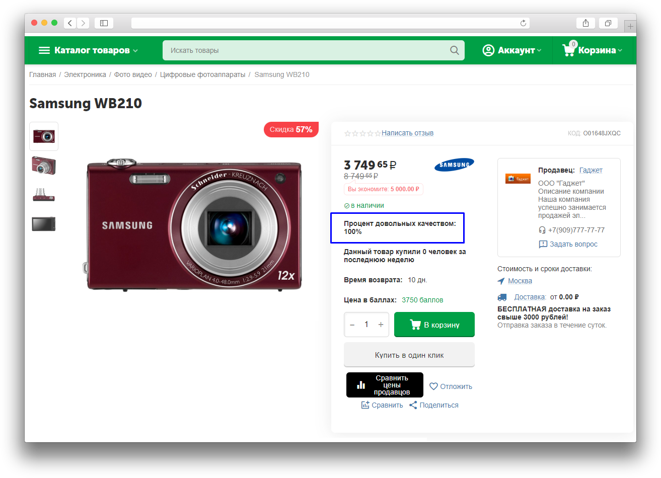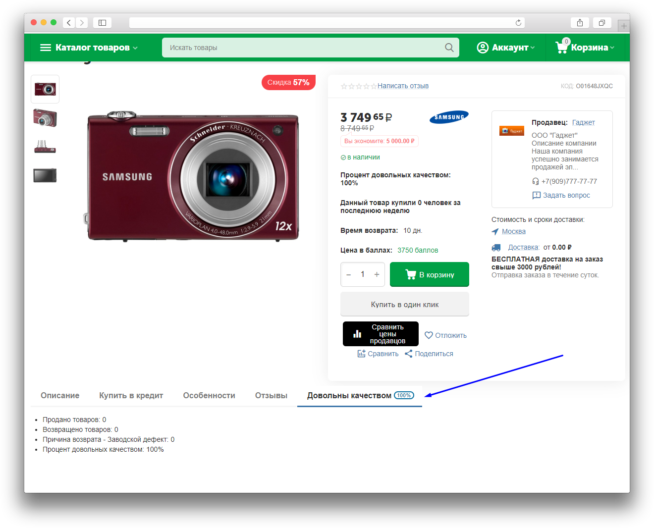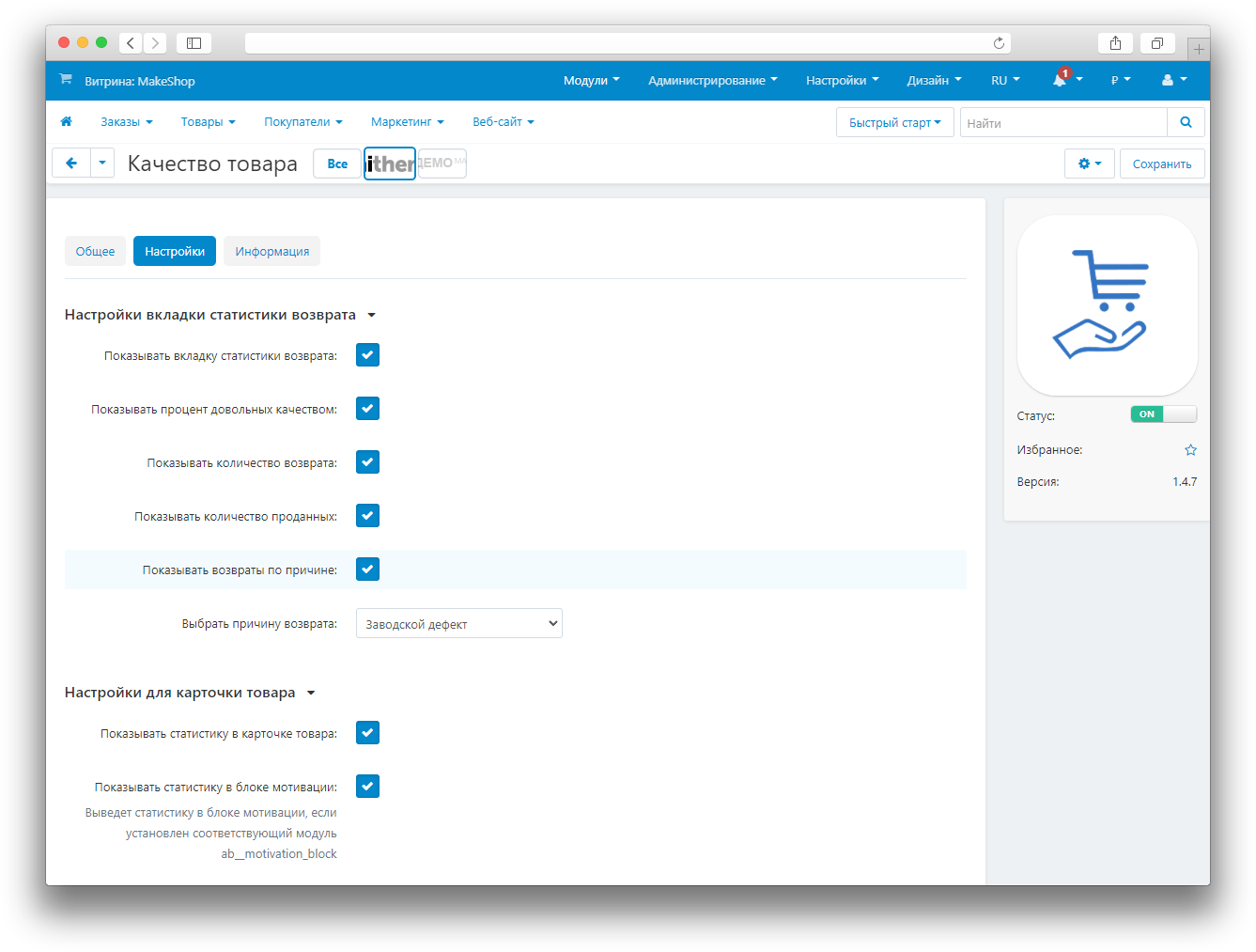 Для этого и был разработан модуль “Качество товара”. Данный модуль позволяет предоставить информацию о браке и возвратах товара на витрине. А конкретнее он показывает это на вкладке в карточке товара. Так же можно вывести статистику в блок мотивации
